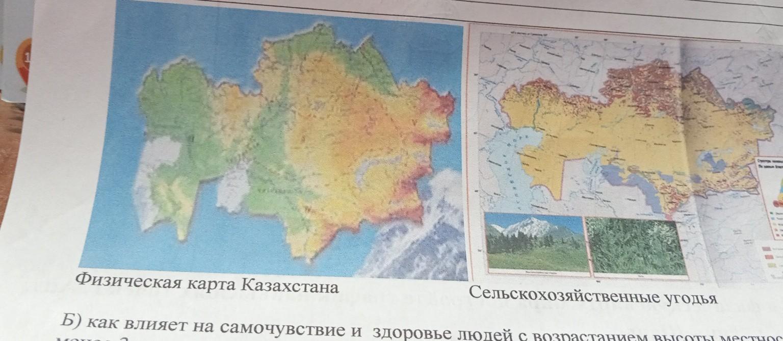 7. а) Сравните физическую карту Казахстана и карту сельскохозяйственных угодий, с вывод о влиянии характера рельефа на хозяйственную деятельность человека.
