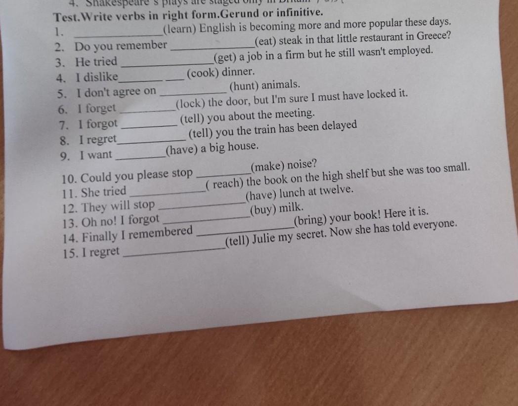 4. Test.Write verbs in right form.Gerund or infinitive. 1. 2. Do you remember 3. He tried (learn) English is becoming more and more popular these days. (eat) steak in that little restaurant in Greece? (get) a job in a firm but he still wasn't employed. (cook) dinner. 4. I dislike 5. I don't agree on 6. I forget 7. I forgot 8. I regret_ 9. I want (hunt) animals. (lock) the door, but I'm sure I must have locked it. (tell) you about the meeting. (tell) you the train has been delayed (have) a big house. 10. Could you please stop 11. She tried 12. They will stop 13. Oh no! I forgot 14. Finally I remembered 15. I regret (make) noise? (reach) the book on the high shelf but she was too small. (have) lunch at twelve. (buy) milk. (bring) your book! Here it is. (tell) Julie my secret. Now she has told everyone.