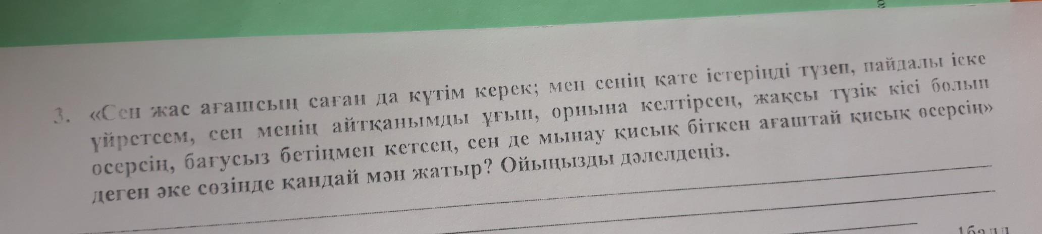 3. «Сен жас агашсып саган да күтім керек; мен сенiн кате iстерiндi түзеп, пайдал үйретсем, сен менін айтқанымды ұғып, орнына келтірсен, жаксы тузiк кiсi осерсін, багусыз бетiнмен кетсен, сен де мынау кисык біткен ағаштай кисык ө деген әке сөзiнде кандай мән жатыр? Ойыңызды дәлелденiз.