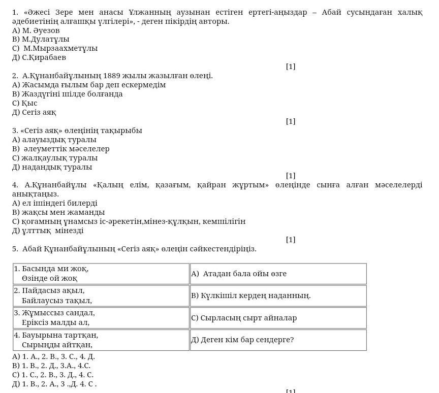 1. «Әжесі Зере мен анасы Ұлжанның аузынан естiген ертегі-аңыздар - Абай сусындаған халық әдебиетінің алғашқы үлгiлерi», - деген пiкiрдiң авторы. А) М. Әуезов В) М.Дулатұлы c) М.Мырзаахметұлы Д) С.Қирабаев Г11