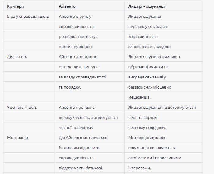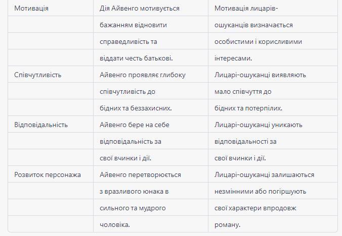 Скласти порівняльну таблицю "Добро і зло в романі В.Скотта "Айвенго" (на прикладі рис Айвенго та лицарів - ошуканців)