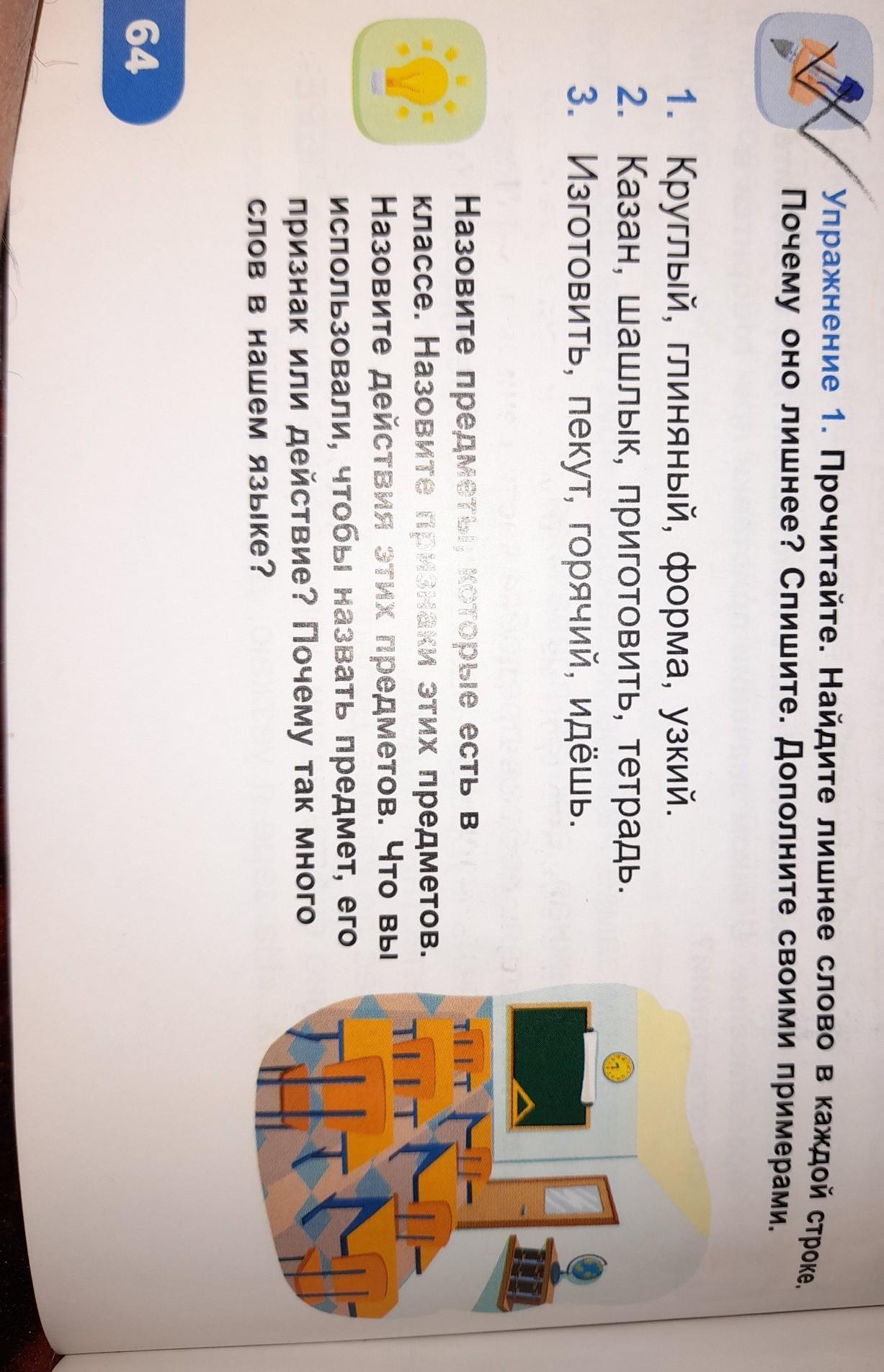 64 Упражнение 1. Прочитайте. Найдите лишнее слово в каждой строке. Почему око лишнее? Спишите. Дополните своими примерами. 1. Круглый, глиняный, форма, узкий. 2. Казан, шашлык, приготовить, тетрадь. 3. Изготовить, пекут, горячий, идёшь. Назовите предметы, которые есть в классе. Назовите признаки этих предметов. Назовите действия этих предметов. Что вы использовали, чтобы назвать предмет, его признак или действие? Почему так много слов в нашем языке?