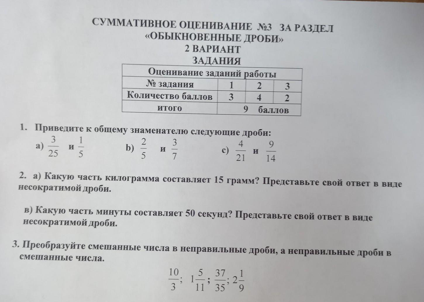 a) И СУММАТИВНОЕ ОЦЕНИВАНИЕ №3 ЗА РАЗДЕЛ «ОБЫКНОВЕННЫЕ ДРОБИ» 5 1 Количество баллов 3 2 ВАРИАНТ ЗАДАНИЯ Оценивание заданий работы № задания 2 3 4 2 баллов 1. Приведите к общему знаменателю следующие дроби: 3 1 4 c) и 25 21 b) итого 2 5 И 3 7 2. а) Какую часть килограмма составляет 15 грамм? Представьте свой ответ в виде несократимой дроби. в) Какую часть минуты составляет 50 секунд? Представьте свой ответ в виде несократимой дроби. 10 3 3. Преобразуйте смешанные числа в неправильные дроби, а неправильные дроби в смешанные числа. 9 9 1 5 11 9 14 ; 37 1 : 2- 35 9