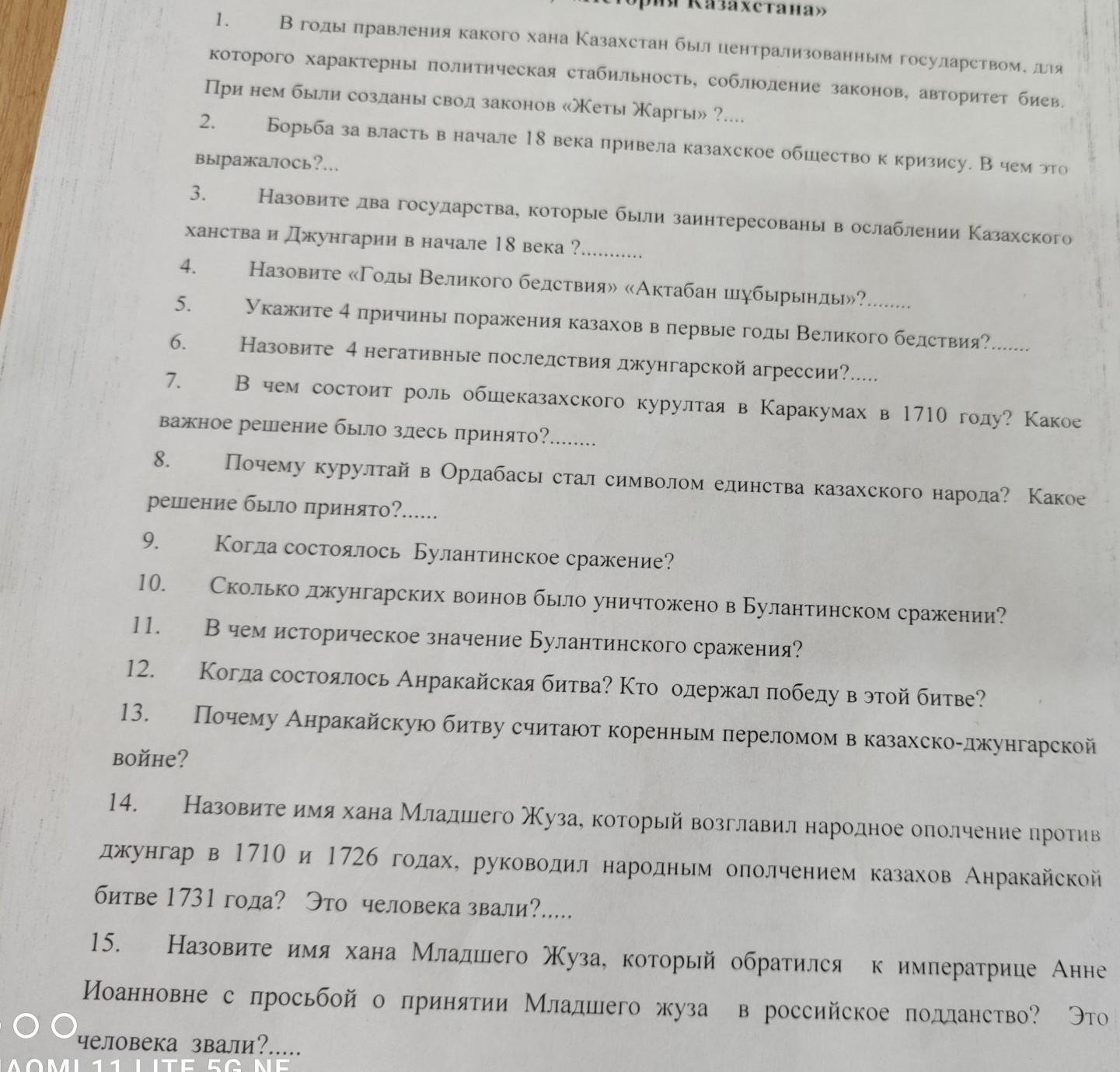 В годы правления какого хана Казахстан был централизованным государством, для которого характерны политическая стабильность, соблюдение законов, авторитет биеп. При нем были созданы свод законов «Жеты Жаргы>> ?.... 2. Борьба за власть в начале 18 века привела казахское общество к кризису. В чем это выражалось?... 3. Назовите два государства, которые были заинтересованы в ослаблении Казахского ханства и Джунгарии в начале 18 века .............. 4. Назовите >