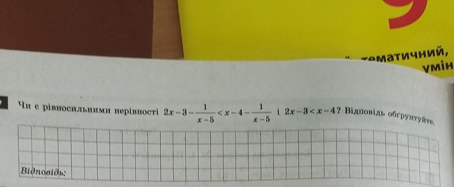 Тепер ми маємо нерівність 2x - 3 < x - 4, яка рівносильна x < -1. Тобто, обидві нерівності рівносильні, і вони вказують на те, що x має бути менше -1.