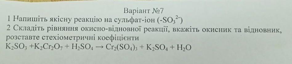 2. Складіть рівняння окисно-відновної реакції, вкажіть окисник та відновник, розставте стехіометричні коефіцієнти K2SO3 +K2Cr2O7 + H2SO4 - ->Cr2(SO4)3 + K2SO4 + H2O
