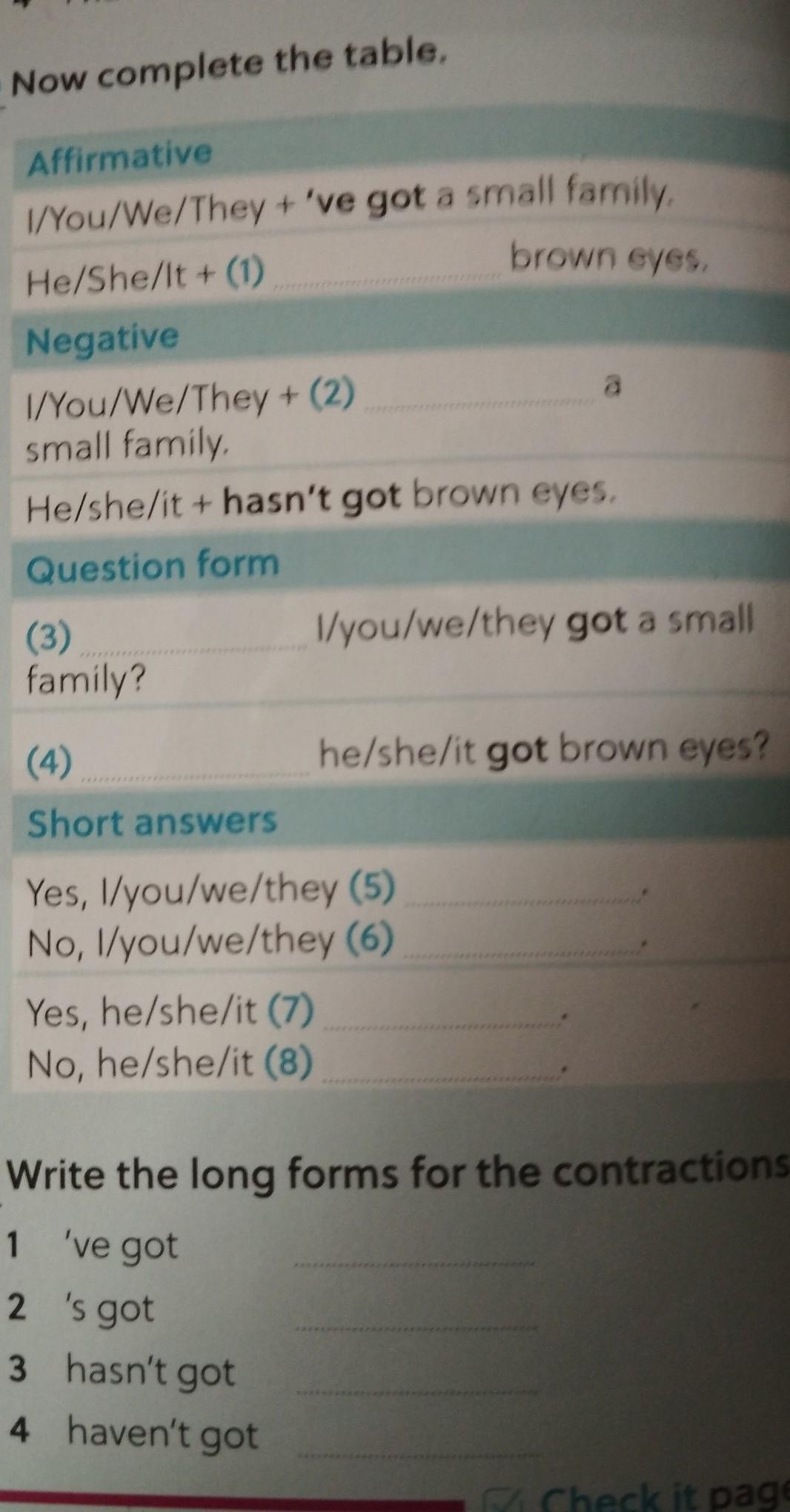 1. 's got, 2. haven't got, 3. Have, 4. Has, 5. have, 6. haven't, 7. has, 8. hasn't.