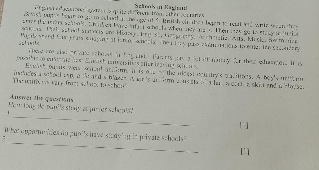Schools in England English educational system is quite different from other countries. British pupils begin to go to school at the age of 5. British children begin to read and write when they enter the infant schools. Children leave infant schools when they are 7. Then they go to study at junior schools. Their school subjects are History. English, Geography. Arithmetic, Arts, Music, Swimming. Pupils spend four years studying at junior schools. Then they pass examinations to enter the secondary schools. Answer the questions How long do pupils study at junior schools? 1 There are also private schools in England. Parents pay a lot of money for their education. It is possible to enter the best English universities after leaving schools. English pupils wear school uniform. It is one of the oldest country's traditions. A boy's uniform includes a school cap, a tie and a blazer. A girl's uniform consists of a hat, a coat, a skirt and a blouse. The uniforms vary from school to school. What opportunities do pupils have studying in private schools? 2 Total [5] [1]