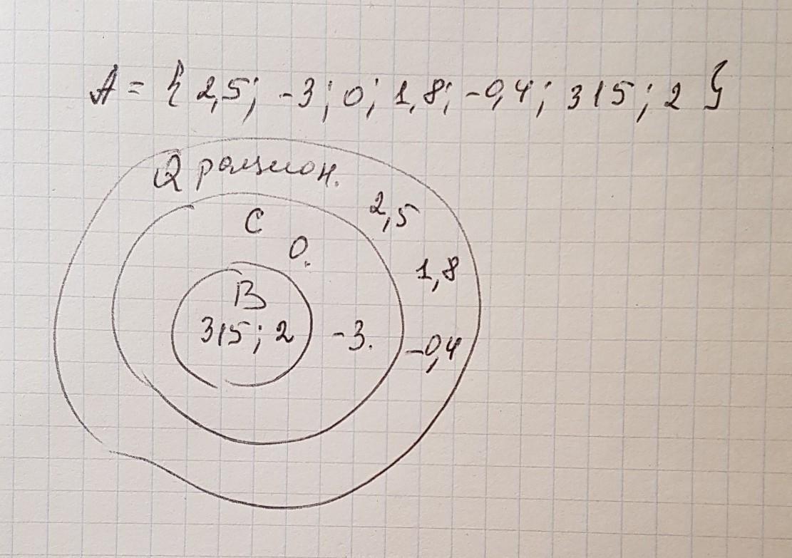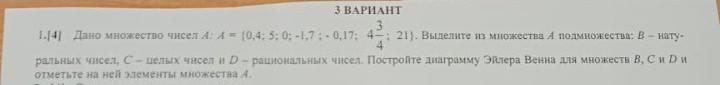 З ВАРИАНТ 1.[4] Дано множество чисел А: 4 = (0,4: 5: 0; -1.74-0,17; 4-; 21). Выделите из множества А подмножества: В - нату- ральных чисел, С - целых чисел и D - рациональных чисел. Постройте диаграмму Эйлера Венна для множеств В, С и D и отметьте на ней элементы множества А.