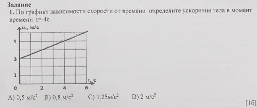 1. По графику зависимости скорости от времени определите ускорение тела в моме времени t= 4с. 10, t/c 5 3 1 С 2 4 4) 0,5 М/c² B) 0,8 м/с² 6 C) 1,25м/с² D) 2 M/c2