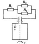 .Хорошо проводящая рамка площадью 30 см^2 вращается в однородном магнитном поле с индукцией 2 Тл перпендикулярно оси вращения рамки с частотой 50 Гц (рис). Скользящие контакты от рамки подключены к цепи, состоящей из резисторов с сопротивлением: R1 = 6 Ом, R2 = 3 Ом, R3 = 9 Ом. Найдите максимальный ток, протекающий через резистор R3 во время вращения рамки.