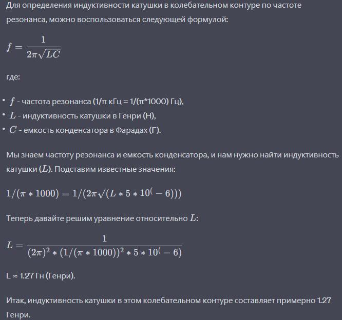 Резонанс в колебательном контуре возникает на частоте 1/π кГц. Если емкость конденсатора в цепи равна 5 мкФ, какова индуктивность катушки в ней?