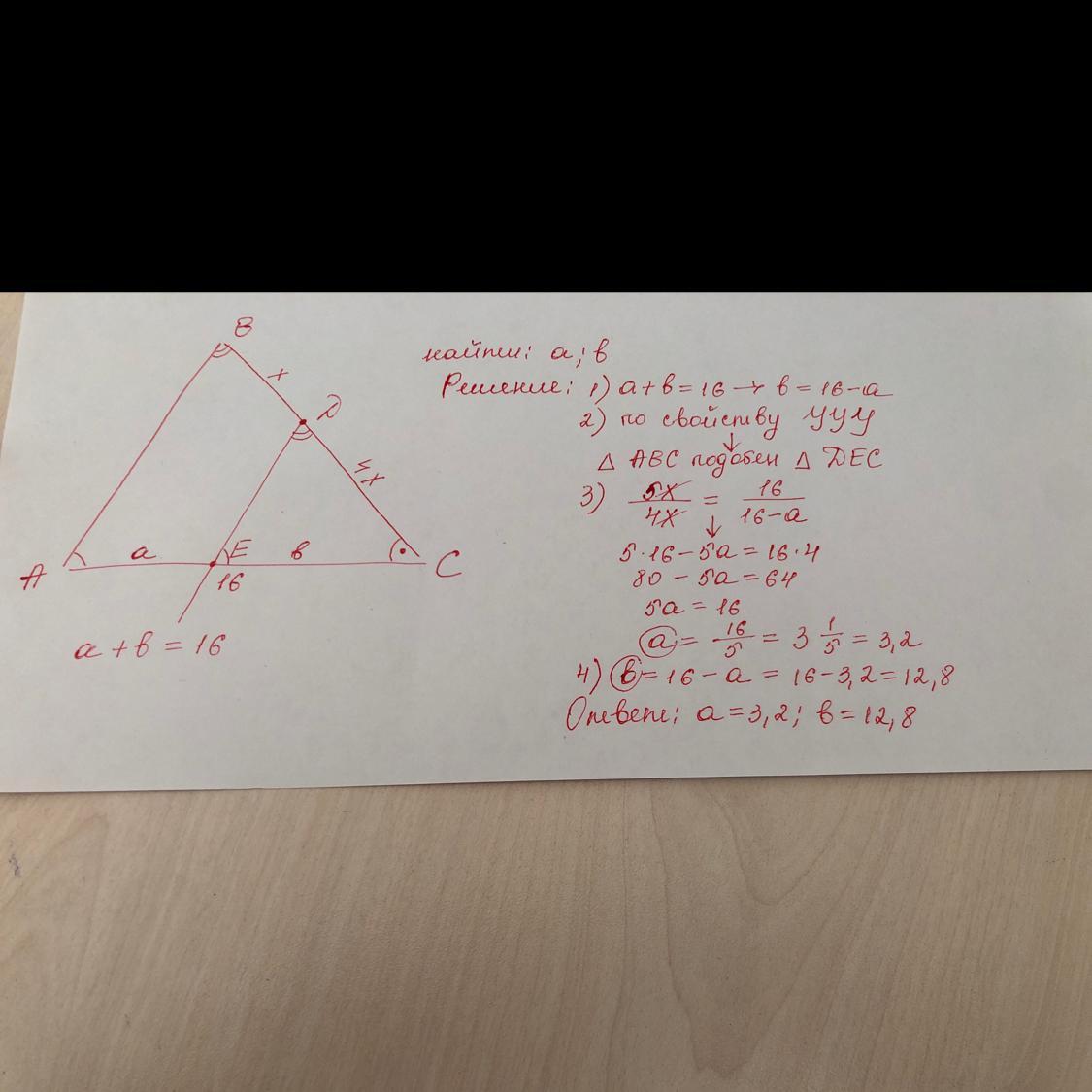 4. Сторона АС треугольника АВС равна 16 см. На стороне ВС взята точка D так, что BD / D * C = 1/4 Через точку D проведена прямая, параллельная АВ и пересекающая АС в точке Е. Чему равны длины отрезков АЕ и ЕС?