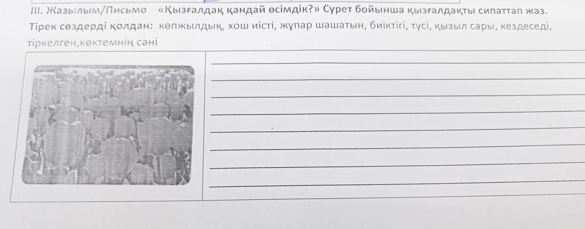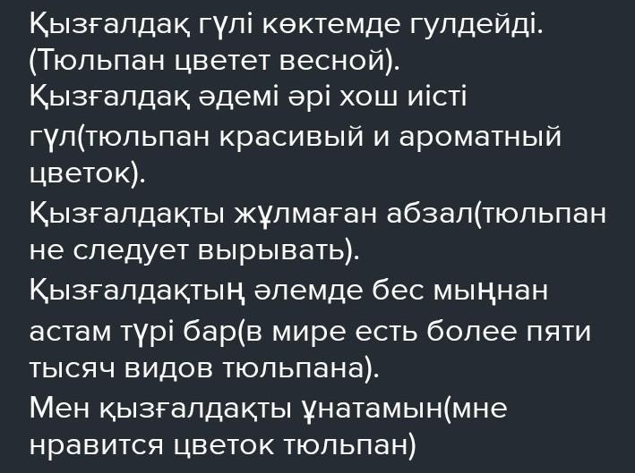 описать тюльпан на казахском языке 10 предложений используя эти слова: көпжылдық хош иісті, жұпар, шашатын, биіктігі, түсі, қызыл сары, кездеседі, тіркелген, көктемнің, сәні
