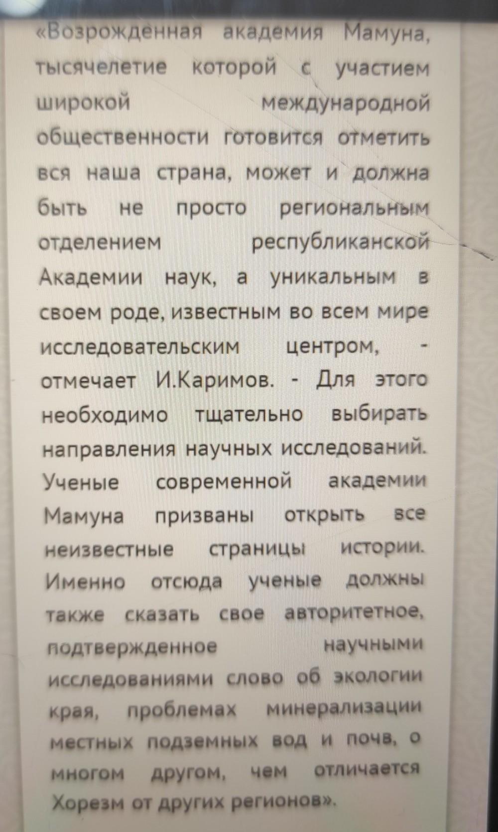"Qayta tug'ilgan akademiyasi Mamuna, ming yillik qaysi ishtiroki bilan xalqaro keng jamoatchilik bayramni nishonlashga tayyorlanmoqda hammasi bizniki mamlakat mumkin va kerak bo'l Yo'q faqat mintaqaviy respublika Bo'lim fan o'ziga xos, butun dunyoga mashhur tadqiqot markazi, Akademiya ichida noyob eslatmalar I. Karimov. Buning uchun zarur yaxshilab tanlang ilmiy tadqiqot yo'nalishlari. Olimlar zamonaviy akademiyasi Mamuna chaqirilgan noma'lum ochiq Aynan bu yerdan Hikoyalar. olimlar kerak. O'z vakolatingizni ham ayting, tasdiqlangan ilmiy ekologiya haqidagi tadqiqot so'zi sahifalar qirralar, mineralizatsiya muammolari mahalliy yer osti suvlari va tuproqlar, o dan ancha ko'p boshqacha.Boshqa viloyatlardan Xorazm”.