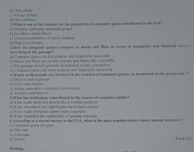 b) Only adults e) All age groups d) Only children 2. What is one of the reasons for the popularity of computer games mentioned in the text? a) Complex gameplay mechanicspopul b) Excellent visual effects c) Limited availability of online features d) High cost of entry 3. How do computer games compare to music and films in terms of popularity and financial - according to the passage? a) Computer games are less popular and financially successful b) Music and films are equally popular and financially successful c) The passage doesn't provide information on this comparison d) Computer games are more popular and financially successful 4. Which professionals are involved in the creation of computer games, as mentioned in the paragri. a) Doctors and engineers b) Chef's and athletes c) Artists, animators, musicians, and writers. d) Teachers and lawyers 5. What has technology contributed to the success of computer games? a) It has made them less accessible to a wider audience b) It has not played any significant role in their success e) It has made computer games more expensive d) It has expanded the capabilities of gaming consoles 6.According to a recent survey in the USA, what is the most popular career choice among teenager- a) Computer game designer b) Film star c) Astronaut d) Doctor To