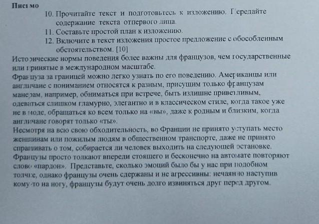 ПИСЕ МО 10. Прочитайте текст и подготовьтесь к изложению. Гередайте содержание текста отпервого лица. 11. Составьте простой план к изложению. 12. Включите в текст изложения простое предложение с обособленным обстоятельством. [10] Исторические нормы поведения более важны для французов, чем государственные или гринятые в международном масштабе. Француза за границей можно легко узнать по его поведению. Американцы или англичане с пониманием относятся к разным, присушим только французам мане зам, например, обниматься при встрече, быть излишне приветливым. одеваться слишком гламурно, элегантно и в классическом стиле, когда такое уже не в моле, обращаться ко всем только на «вы>>, даже к родным и близким, когда англичане говорят только >. Несмотря на всю свою обходительность, во Франции не принято у ступать место женщинам или пожилым людям в общественном транспорте, даже не принято спрашивать о том, собирается ли человек выходить на следующей остановке. Французы просто толкают впереди стоящего и бесконечно на автомате повторяют слово «пардон». Представьте, сколько эмоций было бы у нас при подобном толчке, однако французы очень сдержаны и не агрессивны: нечаянно наступив кому то на ногу, французы будут очень долго извиняться друг перед другом.