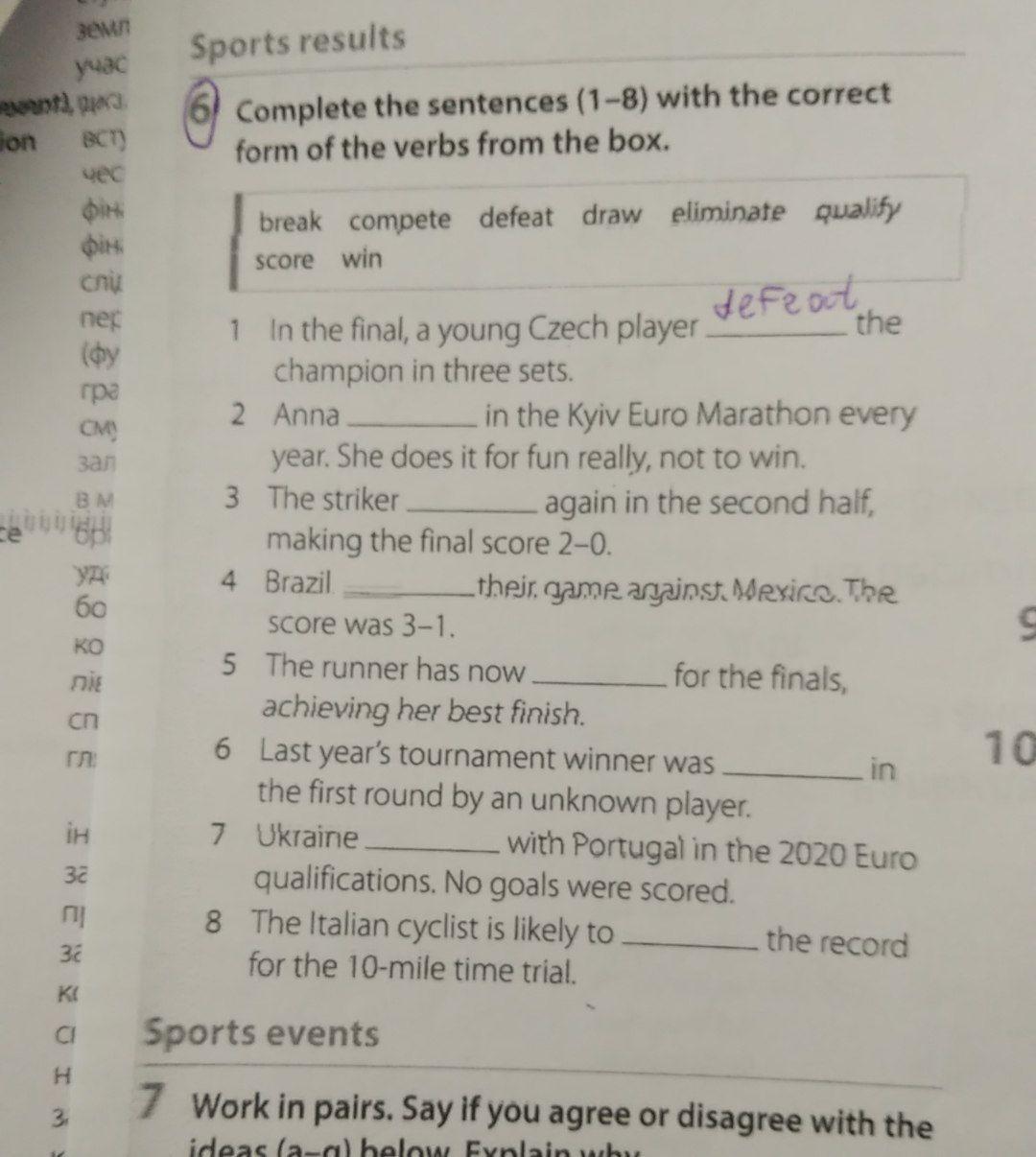 Ответ: 1) eliminated 2) qualifies 3) scored 4) won 5) drawn 6) defeated 7) competed 8) break