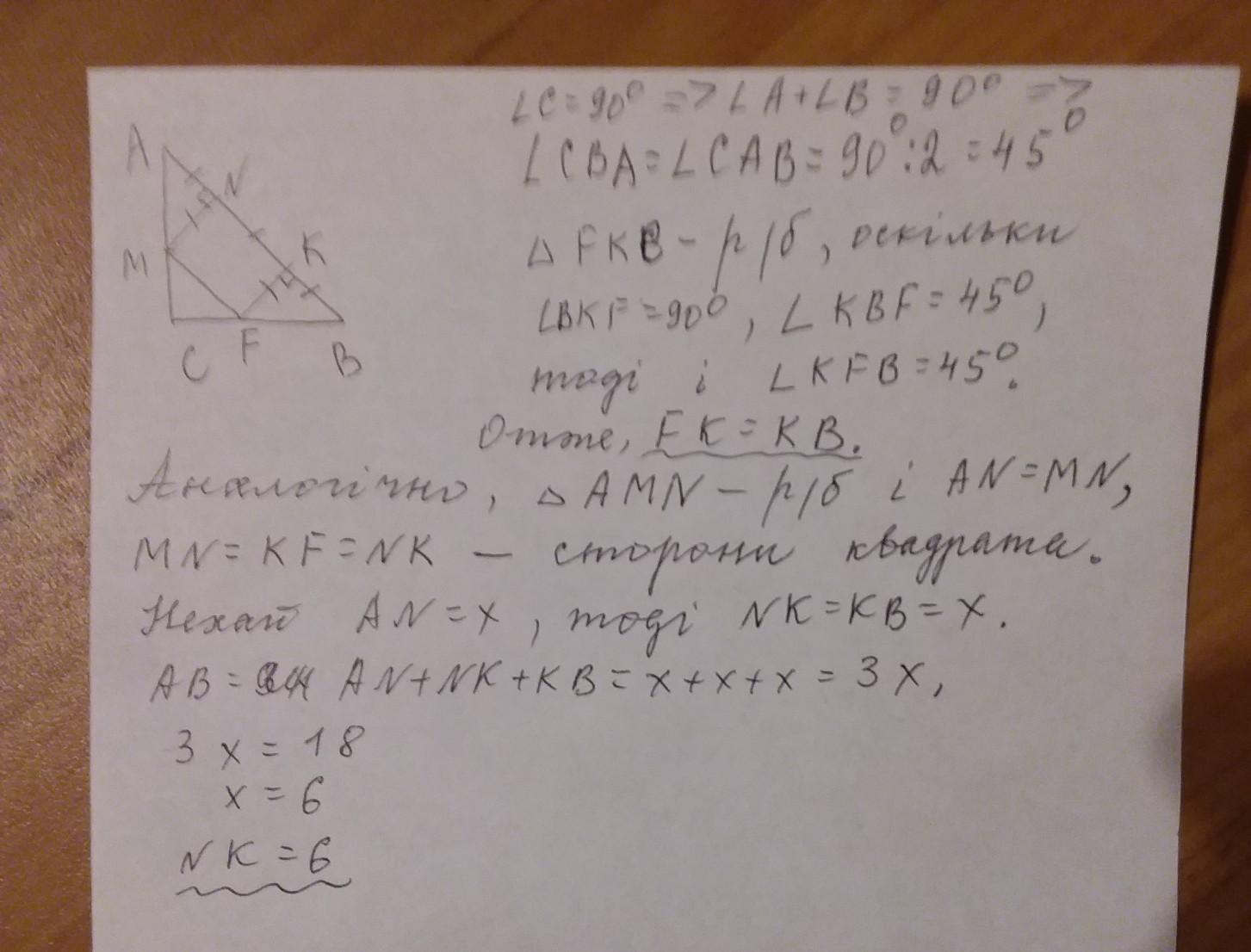 Гіпотенуза рівнобедреного прямокутного трикутника дорівнює 18 см. Ква- драт побудовано так, що дві його вершини лежать на гіпотенузі, а дві інші на катетах поданого трикутника. Знайди периметр квадрата.