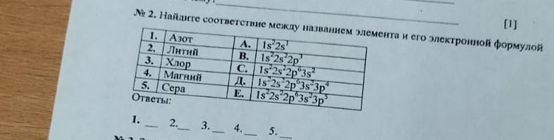 [1] № 2. Найдите соответствие между названием элемента и его электронной формулой 1. Азот A. 1s22s B. 2. Литий Хлор 4. Магний 3. C. 5. Cepa Ответы: 1. № 3. З 2. 3. 1s22s22p 1s 2s 2p 3s2 1s 22s 2p 3s-3p E. 1s 2s 2p 3s23p д. 4. даю 100быллов