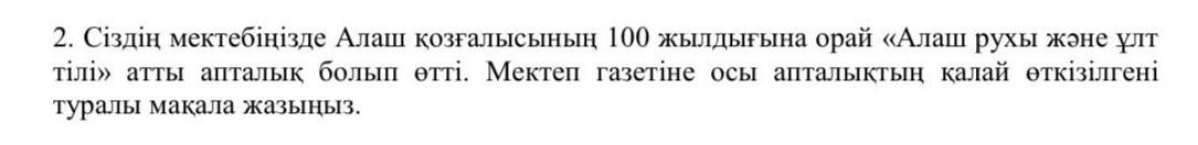 2. Сiздiн мектебіңізде Алаш қозғалысының 100 жылдығына орай «Алаш рухы және ұлт тілі» атты апталык болып өтті. Мектеп газетіне осы апталыктын калай өткізілгені туралы мақала жазыңыз.