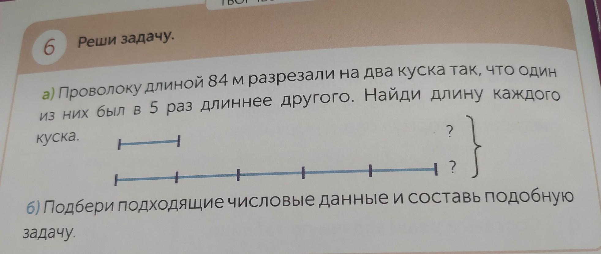Реши задачу. ТВОРЧЕСКАЯ РАБОТА 6 а) Проволоку длиной 84 м разрезали на два куска так, что один из них был в 5 раз длиннее другого.Найли длину каждого куска.