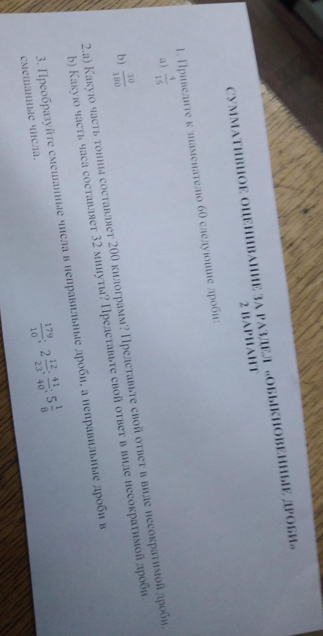 1. Приведите к знаменателю 60 следующие дроби: a) b) 15 СУММАТИВНОЕ ОЦЕНИВАНИЕ ЗА РАЗДЕЛ «ОБЫКНОВЕННЫЕ ДРОБИ 2 BAPHAHT 30 180 2.а) Какую часть тонны составляет 200 килограмм? Представьте свой ответ в виде несокр b) Какую часть часа составляет 32 минуты? Представьте свой ответ в виде несократим 179 10 212, 41: 5 23 40 3. Преобразуйте смешанные числа в неправильные дроби, а неправильные дроби смешанные числами . 8 помогите пожалуйста