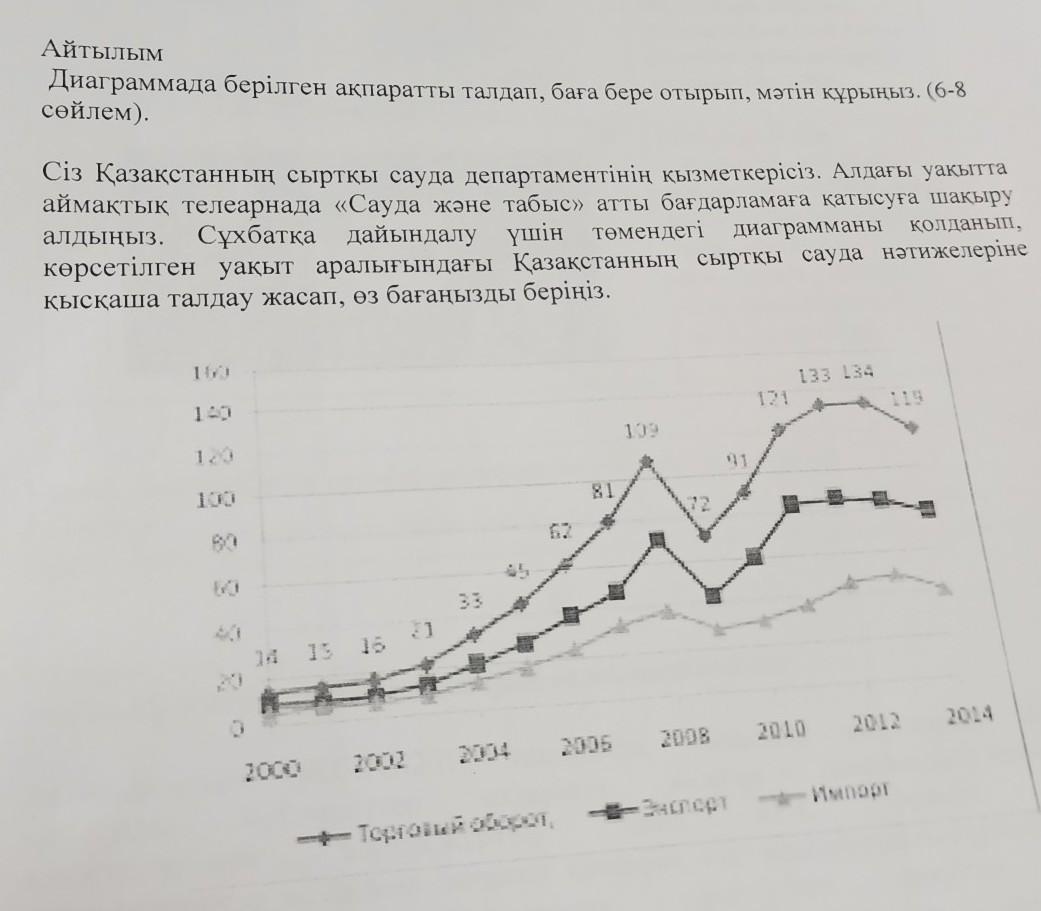 Айтылым Диаграммада берілген ақпаратты талдап, баға бере отырып, мәтін құрыңыз. (6-8 сөйлем). Сiз Қазақстанның сырткы сауда департаментінің қызметкерісіз. Алдағы уақытт аймактык телеарнада «Сауда және табыс» атты бағдарламаға қатысуға шақы алдыныз. Сұхбатқа дайындалу үшін төмендегі диаграмманы көрсетілген уақыт аралығындағы Қазақстанның сыртқы сауда нәтижелер кыскаша талдау жасап, өз бағанызды беріңіз. колдан 160 140 Во 0 14 15 16 21 2000 81 109 121 133 134 2002 2004 2005 2008 2010 2012 2014 Торговий оборот Заспорт Импартд