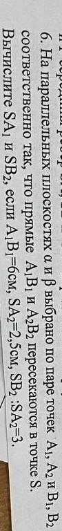 На параллельных плоскостях а и в выбрано по паре точек А1, А2 и В1, В2 соответственно так, что прямые А1В1 и А2В2 пересекаются в точке S. Вычислите ЅA1 и SB2, если А1В1=6см, SA2=2,5см, SB2 : SA2=3.