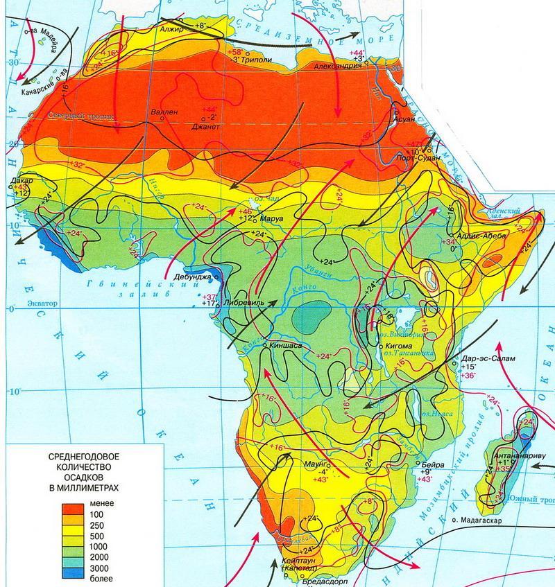 - Південну частину материка (Африка) перетинають ізотерми в січні + 24°, в липні + 8°.