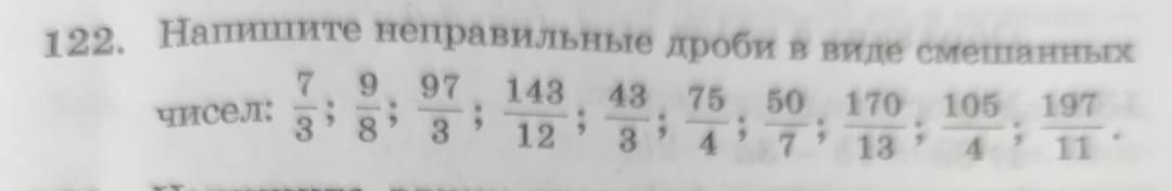 122. Напишите неправильные дроби в виде смешанных 7 9 97 143 43 75 50 170 105 197 3 8 12 13 11 чисел: 9 9