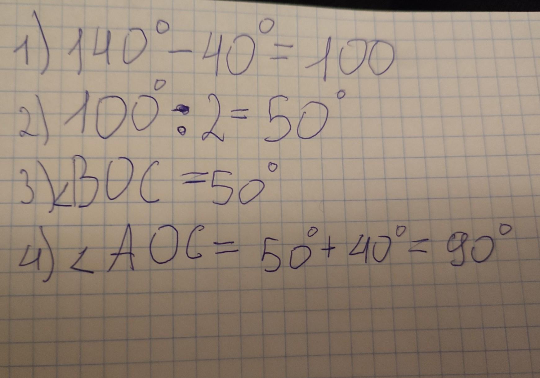 Промінь ОС лежить між сторонами кута АОВ, кут АОВ=140°.Знайдіть кути АОС і ВОС якщо відомо що <АОС-<ВОС=40