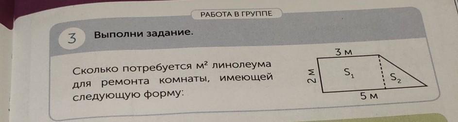 3 Выполни задание. РАБОТА В ГРУППЕ Сколько потребуется м2 линолеума для ремонта комнаты, имеющей следующую форму: 2 м 3 м S, 5 м 52