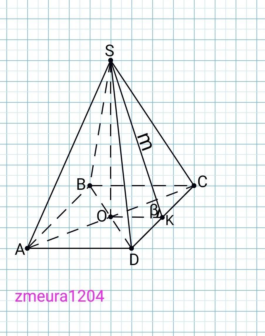 Апофема правильної чотирикутної піраміди дорівнює m, а її бічні грані нахилені до площини основи під кутом Бета. Визначити бічну поверхню піраміди.