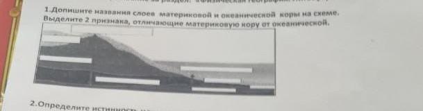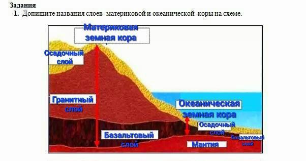 1.Допишите название материковой и океанической коры на схеме. Выделите 2 признака, отличающие материковую кору от океанической