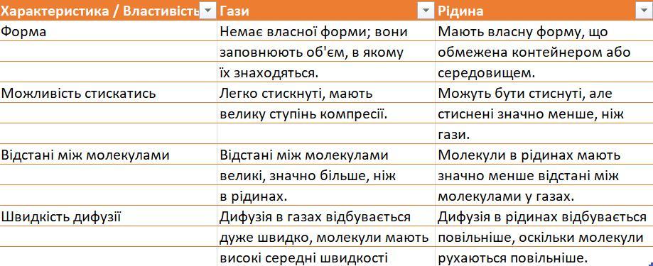 Склади порівняльну таблицю характеристик і властивостей газу рідини. Об ем Форма Властивість Можливість стискатись Відстані між молекулами Швидкість дифузії Гази Рiдина