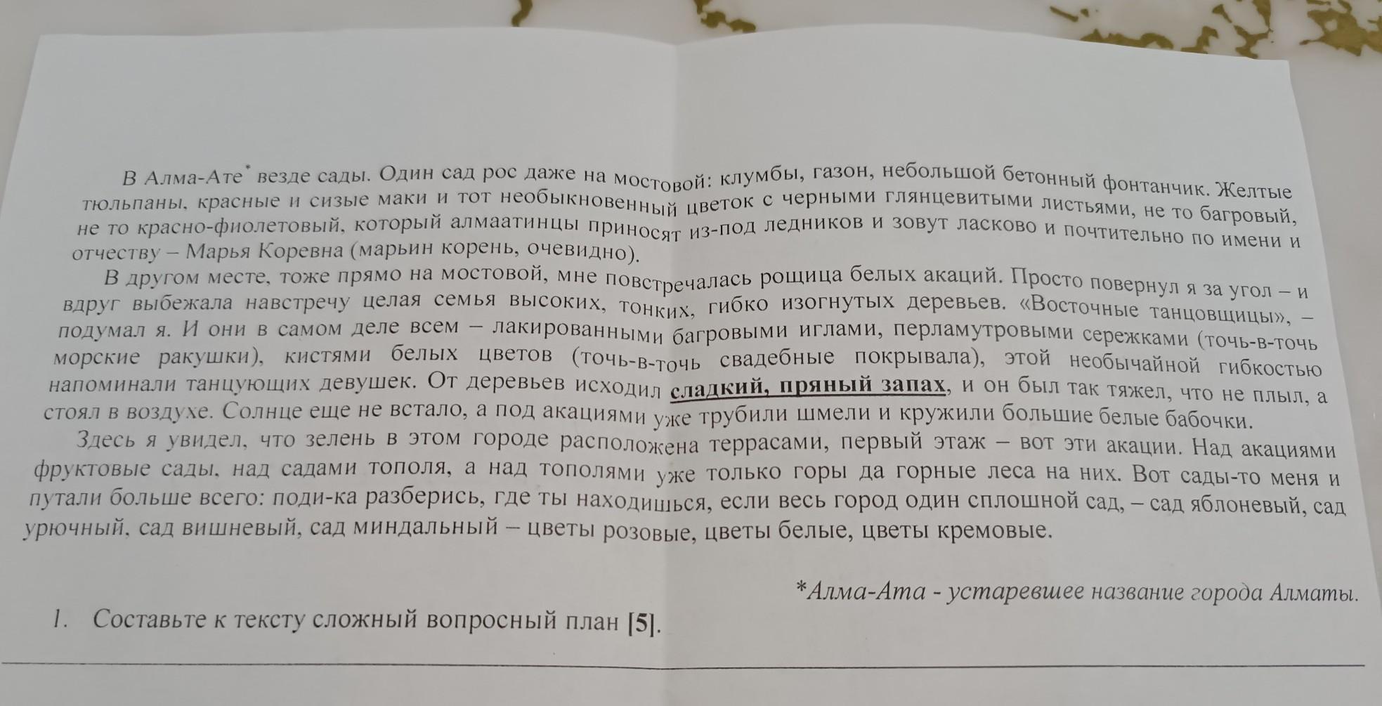 В Алма-Ате везде сады. Один сад рос даже на мостовой: клумбы, газон, небольшой бетонный фонтанчик. Желтые не то красно-фиолетовый, который алмаатинцы приносят из-под ледников и зовут ласково и почтительно по имени и тюльпаны, красные и сизые маки и тот необыкновенный цветок с черными глянцевитыми листьями, не то багровый, отчеству - Марья Коревна (марьин корень, очевидно). белых в другом месте, тоже прямо на мостовой, мне повстречалась рощица белых акаций. Просто повернул я за угол - И вдруг выбежала навстречу целая семья высоких, тонких, гибко изогнутых деревьев. «Восточные танцовщицы», - подумал я. И они в самом деле всем - лакированными багровыми иглами, перламутровыми сережками (точь-в-точь морские ракушки), кистями цветов (точь-в-точь свадебные покрывала), этой необычайной гибкостью напоминали танцующих девушек. От деревьев исходил сладкий, пряный запах, и он был так тяжел, что не плыл, а стоял в воздухе. Солнце еще не встало, а под акациями уже трубили шмели и кружили большие белые бабочки. Здесь я увидел, что зелень в этом городе расположена террасами, первый этаж фруктовые сады, над садами тополя, а над тополями уже только горы да горные леса на них. Вот сады-то меня и путали больше всего: поди-ка разберись, где ты находишься, если весь город один сплошной сад, - сад яблоневый, сад урючный. сад вишневый, сад миндальный - цветы розовые, цветы белые, цветы кремовые. - вот эти акации. Над акациями *Алма-Ата - устаревшее название города Алмат 1. Составьте к тексту сложный вопросный план [5].