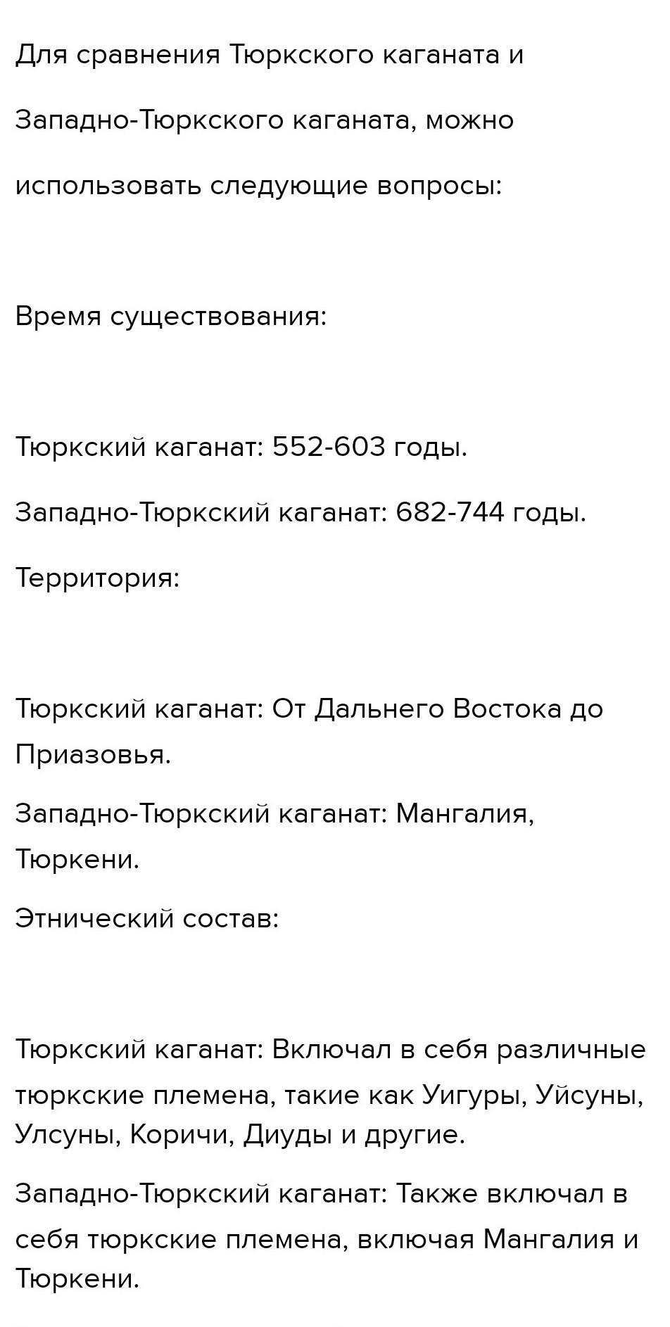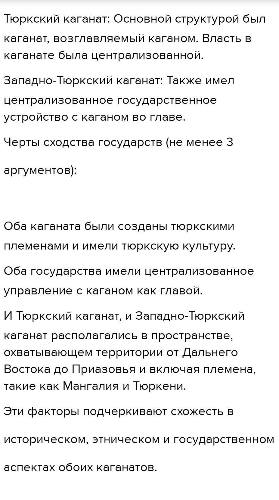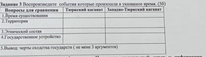Задание 3 Воспроизведите события которые произошли в указанное время. (56) Вопросы для сравнения Тюркский каганат Западно-Тюркский каганат 1.Время существования 2.Территория 3.Этнический состав 4.Государственное устройство 5.Вывод: черты сходства государств ( не мене 3 аргументов