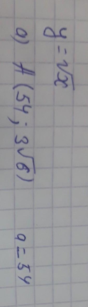 8. у = √х функциясы берілген: а) функциянын графигі А(а:3√6) нүктесiнен етедi. а-нын мәнiн табыныз. b) Егер x ∈ [0; 9], болса, берiлген функция кандай мәндерге ие болады? с) у є [12; 21]болса, аргументтiн мәнін табыңыз d) у < 2тенсiздiгi бойынша х-тi табыныз