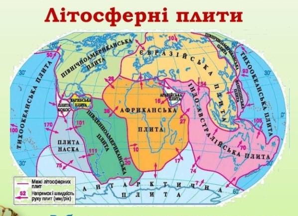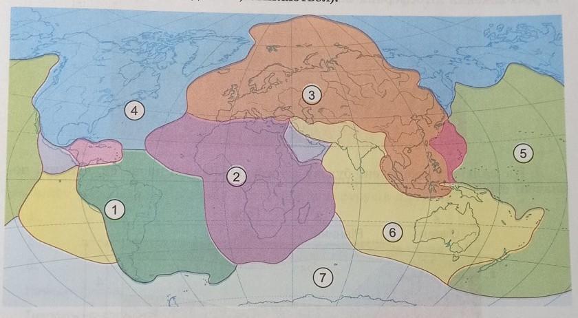1. Використавши карти шкільного атласу, підпиши позначені на малюнку сім найбільших літосферних плит Землі. Стрілочками покажи напрям руху літосферних плит (розходяться, стикаються).