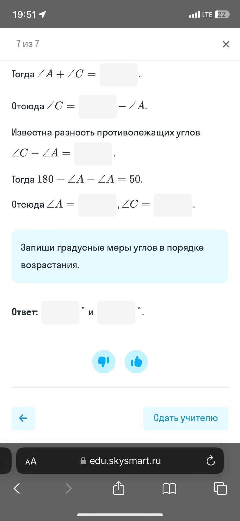Пусть ∠BAC = α (∠BAD = 2α). Проведём через С прямую, параллельную АВ. Пусть она пересекает AD в точке Х. Тогда ABCX - параллелограмм. Значит противоположные стороны равны: BC = AX. AD в 2 раза больше BC, которое равно AX, значит X - середина AD. ∠ACX = ∠CAB = α = ∠CAX, значит AX = CX = AB. При этом AB = CD, т. к. трапеция равнобокая, значит XD=DC=CX, т. е. ΔXDC - равносторонний. Значит ∠ADC = 60°, ∠DAB = ∠ADC, т. к. трапеция равнобокая, т. е. ∠DAB = 60°, ∠ABC = ∠BCD = 180°-60° = 120° по свойству трапеции Ответ: ∠ABC=∠BCD=120°, ∠CDA=∠DAB=60° 0 0 Спроси у Chat GPT бесплатно без регистрации! Топ вопросов за вчера в категории Геометрия Геометрия 09.04.2020 09:49 4056 Тулегалиев Аслан Две стороны треугольника равны 10 см и 12 см, а угол между ними 120 градусов. Нужно найти третью сто Ответов: 1 Геометрия 08.08.2020 06:26 1374 Зарубин Кирилл Одна сторона треугольника на 8 см больше чем другая, а угол между ними ровняется 120 градусов. Найти Ответов: 1 Геометрия 04.06.2023 15:41 1827 Жебрикова Ирина На рисунке изображён план сельской местности. Оля на летних каникулах приезжает в гости к дедушке в Ответов: 1 Геометрия 28.02.2021 04:29 2255 Шишов Вова Найдите радиус окружности описанной около треугольника со сторонами 13,20,21Ответов: 2 Геометрия 23.06.2020 22:45 1528 Осипов Кирилл Одна сторона треугольника на 3 см меньше другой, а угол между ними равен 60°. Найдите периметр треуг Ответов: 1 Геометрия 17.07.2023 11:59 1089 Олина Инга Определите, остроугольным, прямоугольным или тупоугольным является треугольник со сторонами 7 см, 10 Ответов: 2 Геометрия 15.06.2020 23:13 1927 Валеева Арина В треугольнике известно,что АВ = 3 корень из 2 ; угол С = 45 градусов; угол А = 120 градусов. Найдит Ответов: 1 Геометрия 16.07.2023 13:12 1271 Скребцов Даниил Найдите радиус окружности, вписанной в треугодьник со сторонами 4 см, 13 см, 15 см. ( Только чтобы б Ответов: 2 Геометрия 04.04.2021 14:44 1579 Семкин Женя В треугольнике ABC известно, что AC = 9√3 см, ∠B = 60°, ∠C = 45°. Найдите сторону AB треугольника. Ответов: 2 Геометрия 23.11.2020 09:40 1145 Еронин Даниил В треугольнике ABC известно BC=7√2.угол А=135*,угол B=30* найдите сторону AC треугольника Помогите п Ответов: 1 Последние заданные вопросы в категории Геометрия Геометрия 24.10.2023 07:50 15 Телегин Павел Помогите написать объемное сочинение - РАССУЖДЕНИЕ на тему "геометрия в моей квартире" С ПРИМЕРАМИ Ответов: 1 Геометрия 24.10.2023 07:50 27 Игилик Нурсултан Даю 25 баллов ! Дан треугольник ABC, где A = 90 градусам, B= 25 градусам. a = 18 cm. Найдите b и c Ответов: 1 Геометрия 24.10.2023 07:50 22 Бабич Сабина Решите пожалуйста номер 1, 8 класс, геометрия!!! Ответов: 1 Геометрия 24.10.2023 07:47 18 Максимова Дашуля Даю 40 баллов! Письменно! На отрезке AB отмечена точка C, где AC > BC. Расстояние между середин Ответов: 1 Геометрия 24.10.2023 07:46 23 Куприянчик Влад Помогите сроооочно пж Найдите отношение площади круга к длине окружности, если R=3 см Ответов: 1 Геометрия 24.10.2023 07:46 9 Шевченко Анастасия Helppp ПОМОГИТТТЕЕЕЕЕЕЕЕЕЕЕЕ СРОЧННООООО!!!!!!!!!!Ответов: 1 Геометрия 24.10.2023 07:46 25 Бобровський Бодя Составьте уравнение прямой проходящей через точки А (-2;1) и В (4;7)Ответов: 1 Геометрия 24.10.2023 07:46 30 Хомяк Александра Решите пожалуйста 5 задание, 8 класс, геометрия! Ответов: 1 Геометрия 24.10.2023 07:40 21 Ровенских Лиза Какие из следующих утверждений верны 1. Один из углов треугольника всегда превышает 60 градусов. 2 Ответов: 1 Геометрия 24.10.2023 07:40 23 Kiseļovs Aleksandrs Найдите сумму градусных мер внешних углов взятых по одному при каждой вершине для четырехугольника A Ответов: 1 < ПредыдущийСледующий > Предметы Математика Литература Алг