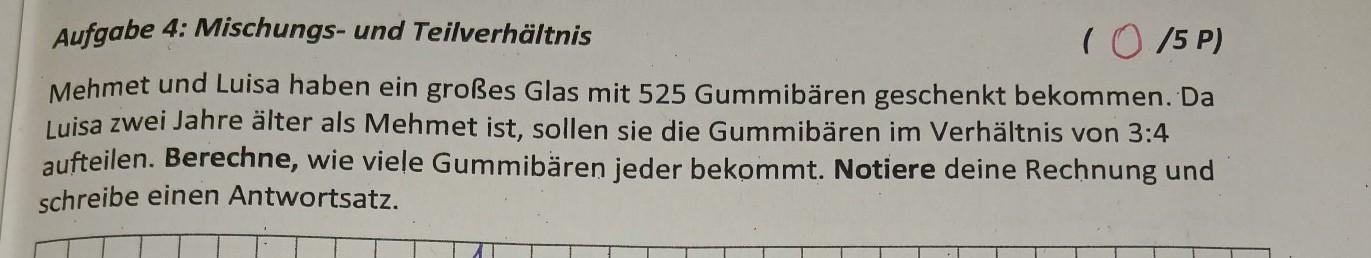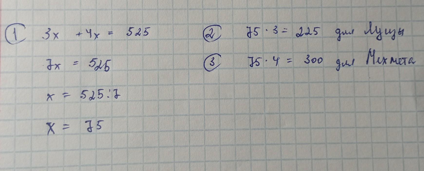 Мехмет і Луїза отримали велику склянку з 525 гумнібярен. Оскільки Луїза старша за Мехмета на два роки, вони повинні розділити ведмедів-гумок у співвідношенні 3:4. Запустіть рахунок і напишіть відповідь.