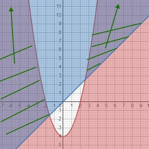 Определяем, где выполняется неравенство у ≤ х²- 4. Для этого берем любую точку, подставляем в неравенство и таким образом определяем, выполняется ли оно на области, которой принадлежит точка.