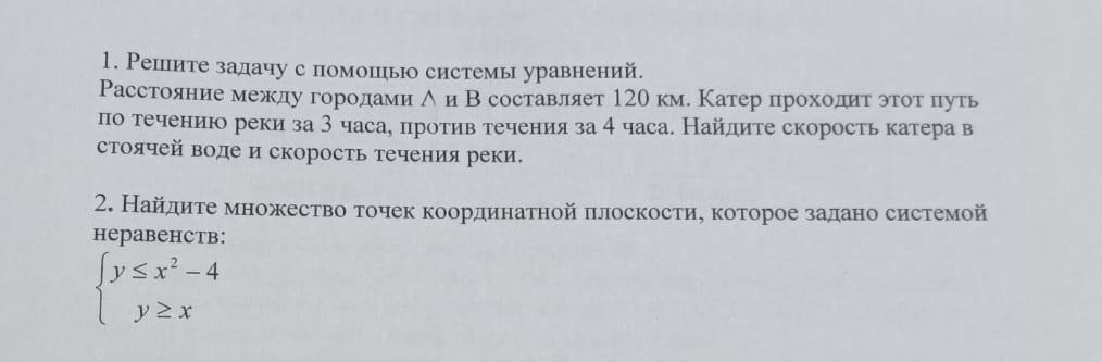 1. Решите задачу с помощью системы уравнений. Расстояние между городами А и В составляет 120 км. Катер проходит этот путь по течению реки за 3 часа, против течения за 4 часа. Найдите скорость катера в стоячей воде и скорость течения реки.
