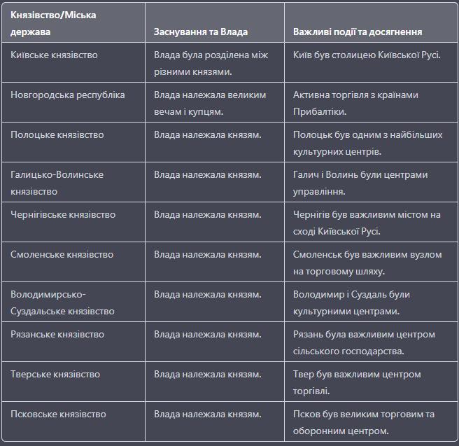 Звісно, ось таблиця розвитку деяких князівств і міських держав під час розпаду Київської Русі: