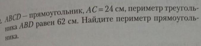 ABCD - прямоугольник, АС = 24 см, периметр треуголь- ника ABD равен 62 см. Найдите периметр прямоугольника.