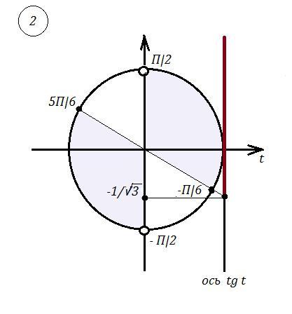 На оси тангенсов отмечаем значение функции tg t = - 1/√3 и определяем , где лежат значения функции , бОльшие -1/√3 . Надо не забыть выколоть точки , в которых не существует функция tg t , то есть точки t = П/2+Пn , n∈Z .
