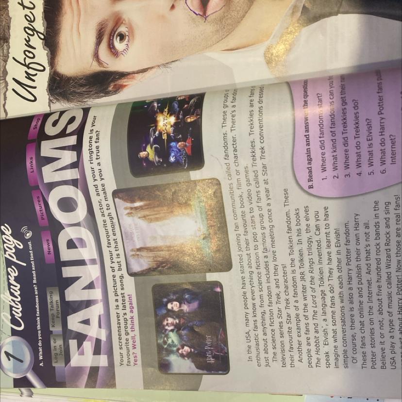 In the USA, numerous individuals are enthusiastically joining fan communities known as fandoms, where they immerse themselves in knowledge about their favorite books, films, or characters, spanning diverse interests from science fiction to pop stars. Notable examples include Trekkies, dedicated fans of the Star Trek series, who gather annually at conventions dressed as their beloved characters. Another fandom centers around JRR Tolkien's works, with fans even learning the Elvish language from his books. Additionally, there's a vibrant Harry Potter fandom where fans engage in online discussions and create their own stories. Surprisingly, around five hundred rock bands in the USA play Wizard Rock, a genre inspired by Harry Potter, showcasing the remarkable depth of fandom culture.