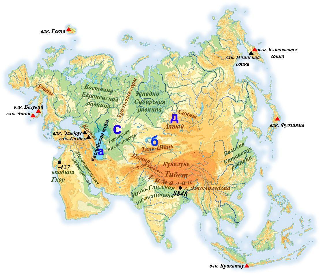 Срочно!!! Помогите! Задание на русском: Отображение изображения на карте с помощью атласа. a) каспийское море; б) тянь шань гору; с)Туранскую долину; д) Алтай гору