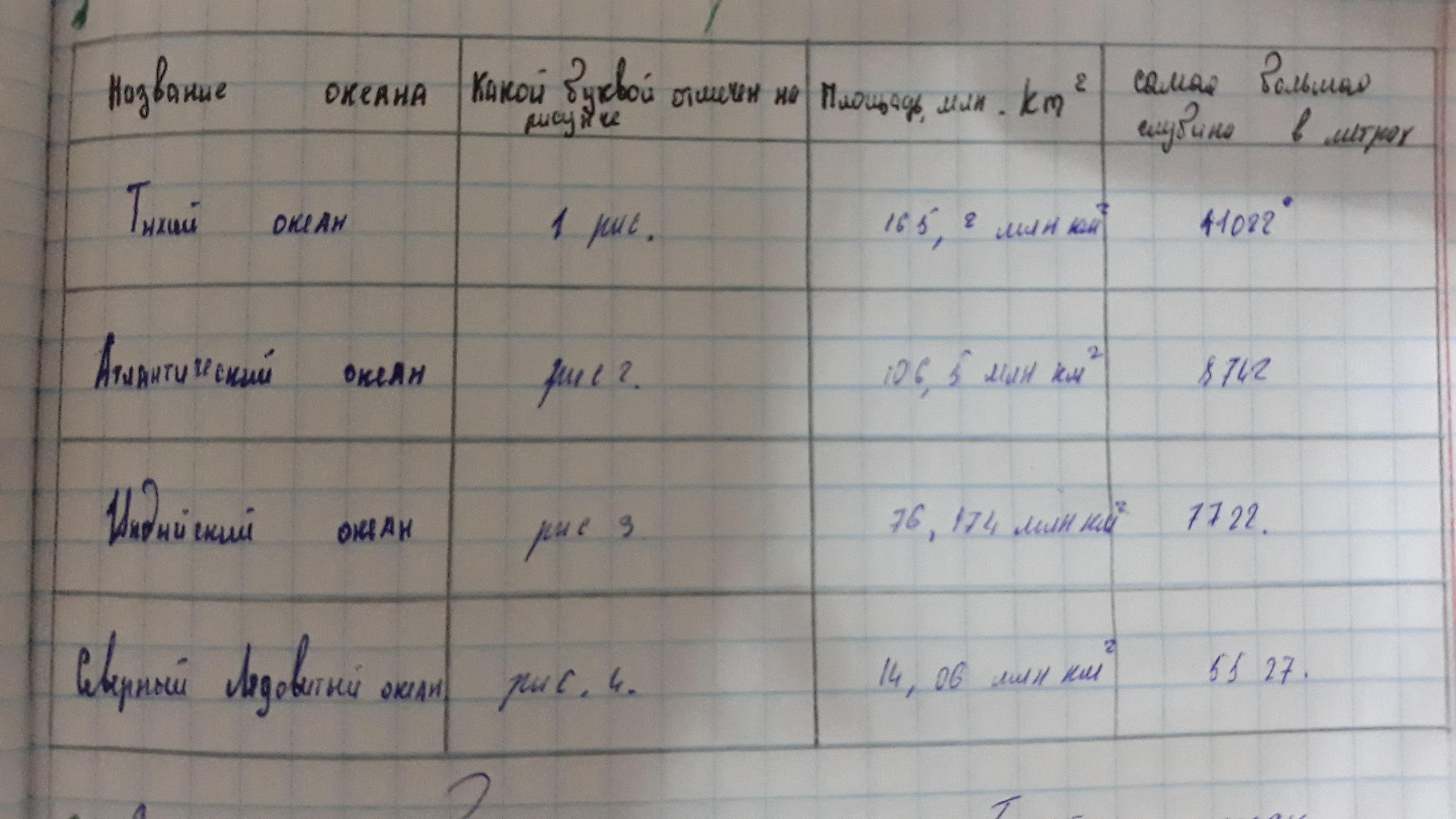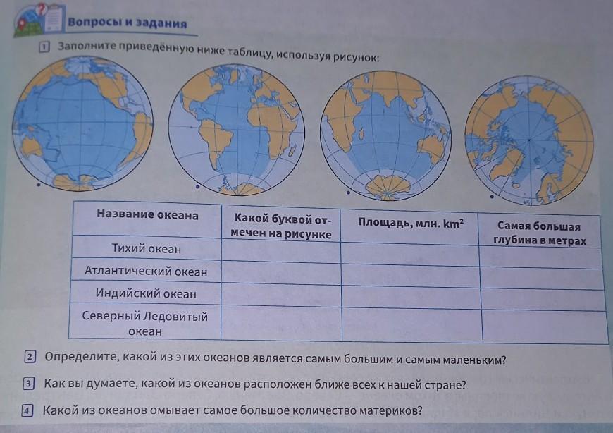 Заполните приведенную ниже таблицу, используя рисунок: Название океана Тихий океан Атлантический океан Индийский океан Северный ледовитый океан Какой буквой от- на рисунке мече Площадь, млн. км² Саламая больша глубина в метр 2 Определите, какой из этих океанов является самым большим и самым маленьким? 3 Как вы думаете, какой из океанов расположен ближе всех к нашей стране? 4 Какой из океанов омывает самое большое количество материков?